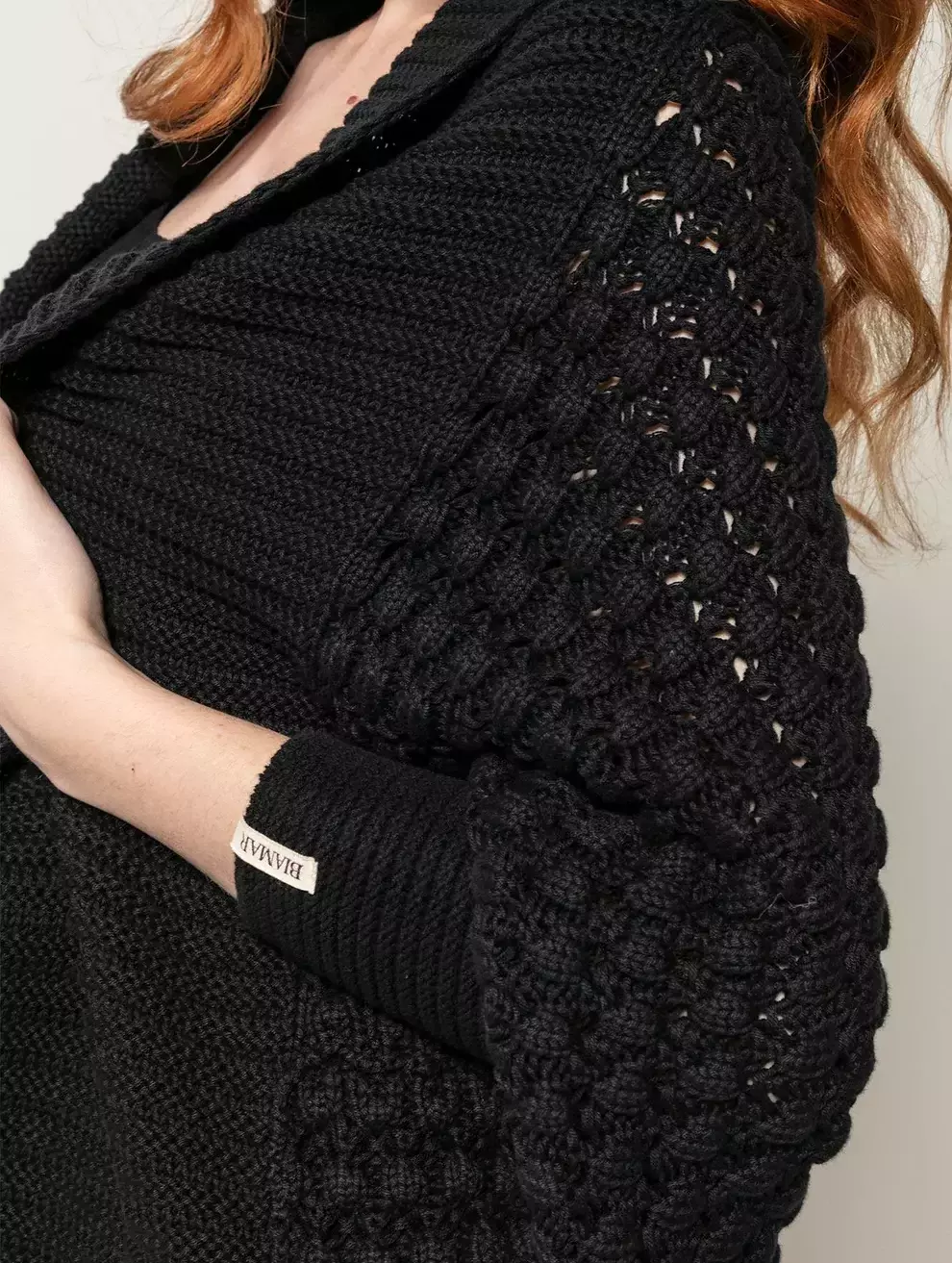 O casaco de algodão em ponto pipoca, assimétrico e sem fechamento frontal Biamar envolve o corpo feito um abraço e confere muito mais sofisticação e estilo para os looks.